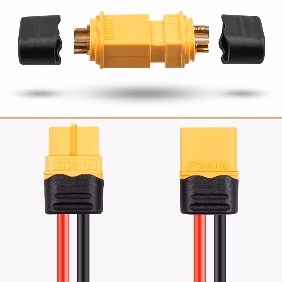 Set de 5 perechi XT60H tată + mamă, cupru placat cu aur și corp din nylon rezistent la temperaturi ridicate. Ideal pentru aplicații RC, BMS, trotinete și biciclete electrice. XT60H este versiunea îmbunătățită a standardului XT60, oferind contacte aurite, rezistență mai mare la curent și compatibilitate cu conectorii XT60 standard.
