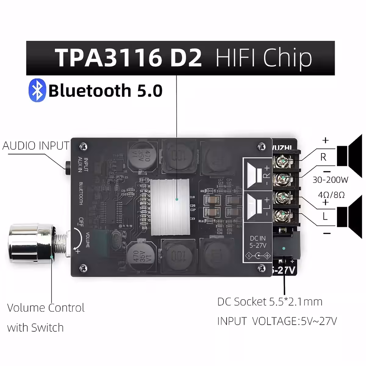 Acest modul combină eficiența unui amplificator clasa D 2x50W cu flexibilitatea conectivității wireless. Poți reda muzică prin Bluetooth sau prin intrarea audio jack 3.5mm, fiind perfect compatibil cu difuzoare pasive de 4-8 Ohmi și 50–200W.