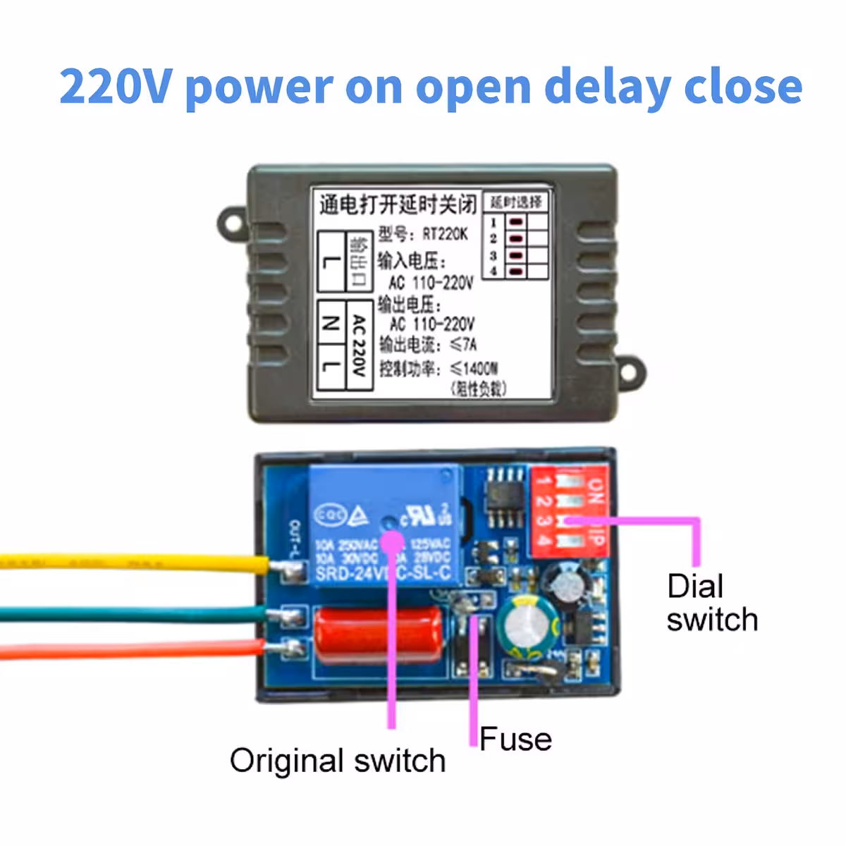 Modul releu de timp mecanic/analogic 1–480 min – întârziere la oprire (OFF-delay / temporizare la revenire), AC 220V 7A