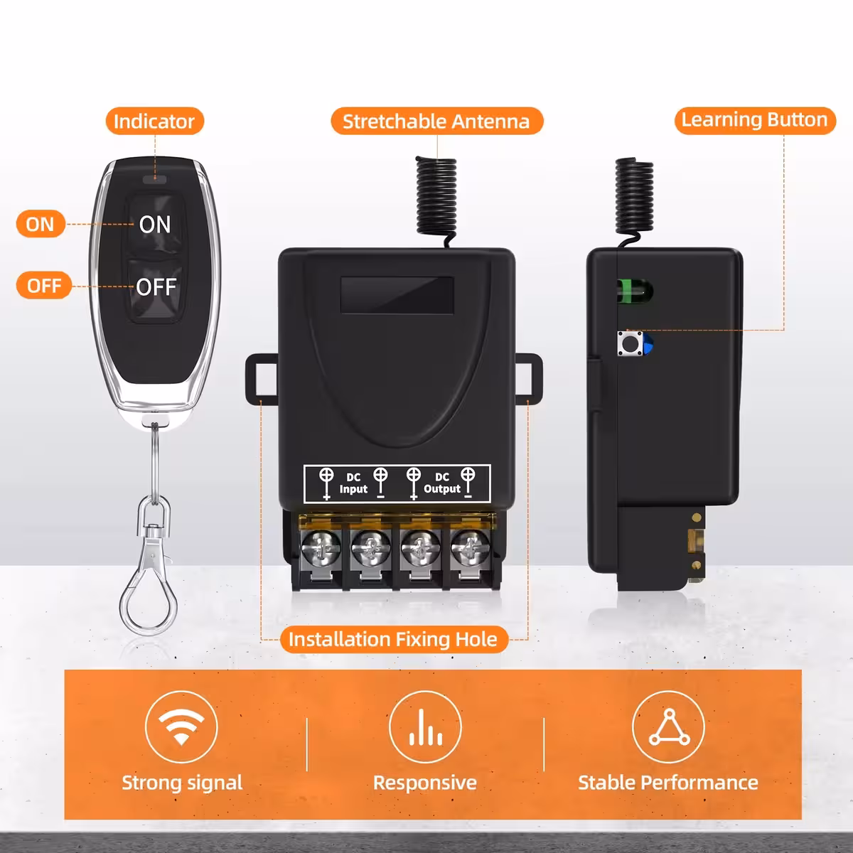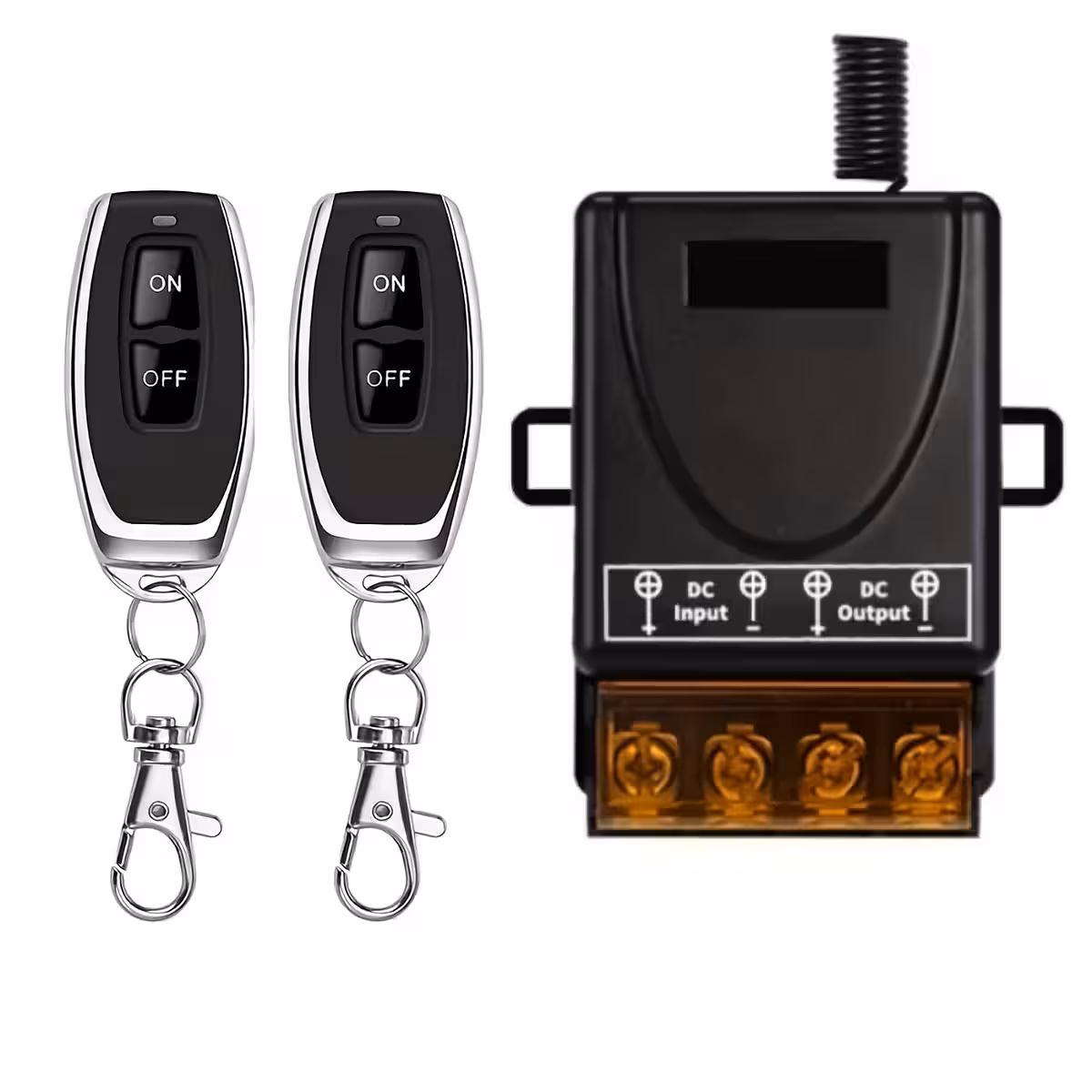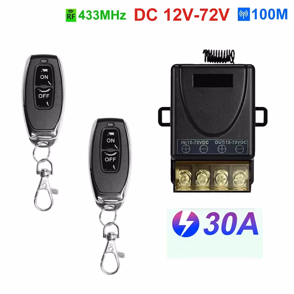 Releu wireless 12V–60V 30A cu 2 telecomenzi – control stabil pentru echipamente și automatizări