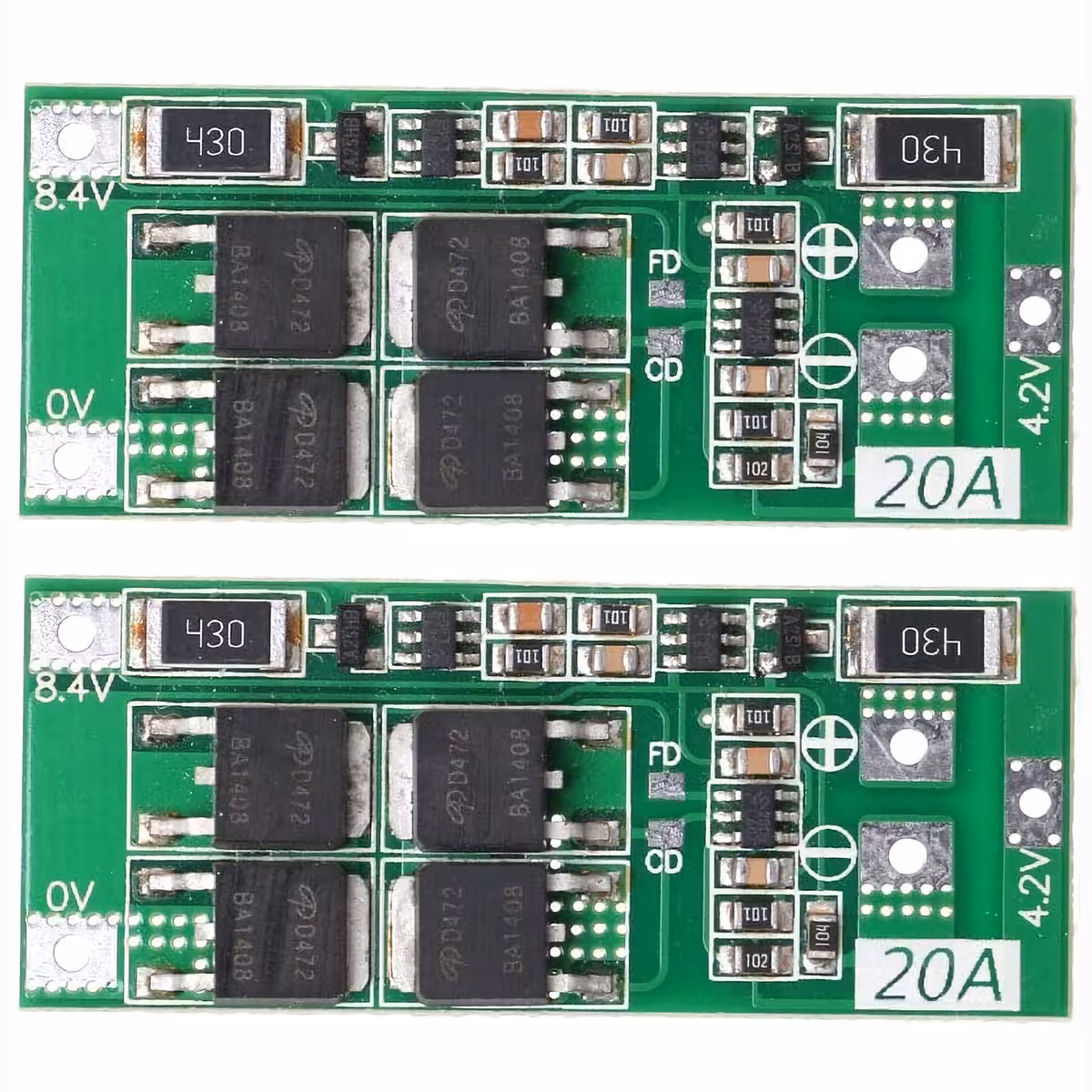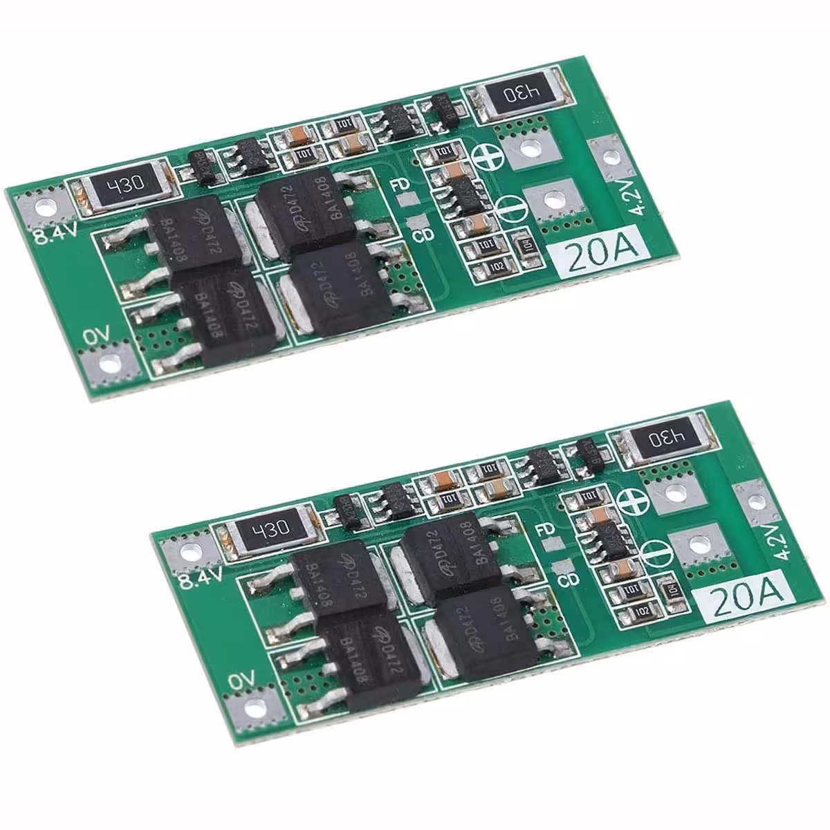 Set format din 2 plăci BMS 2S 20A (7.4V nominal / 8.4V full) cu funcție de balansare, concepute pentru protecția și managementul pachetelor Li-Ion (inclusiv 18650 și 26650). Oferă protecții complete: supraîncărcare, supradescărcare, supracurent, scurt-circuit și resetare automată. Dimensiuni compacte, ideale pentru proiecte DIY și echipamente portabile.