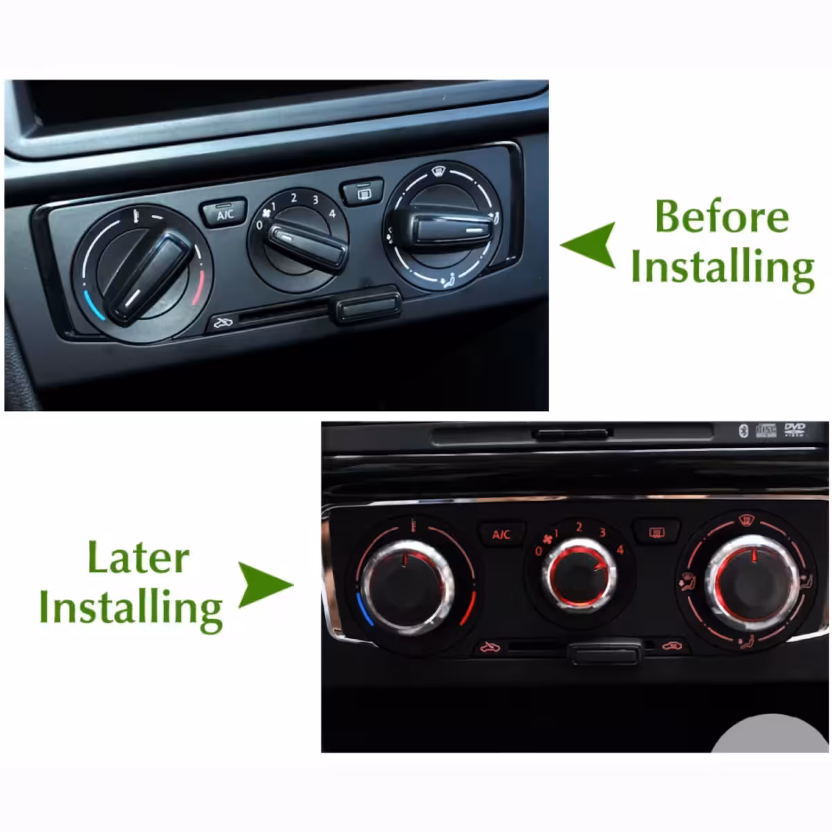 Setul de 3 butoane rotative pentru aer condiționat / climatronic este ideal pentru înlocuirea celor originale deteriorate de pe bordul modelelor VW, Skoda și Seat. Se montează ușor, fără demontarea consolei centrale și oferă un aspect modern și elegant interiorului mașinii.