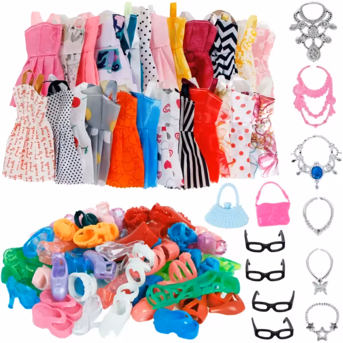 Set complet de îmbrăcăminte, încălțăminte și accesorii pentru păpuși Barbie, ideal pentru fetițe pasionate de modă și joacă creativă.